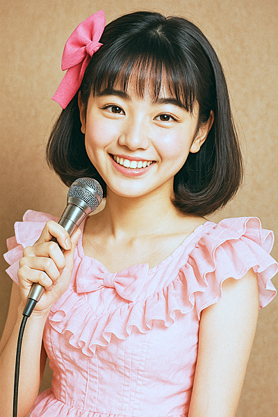 そこで、さらに調子に乗って、「10代の昭和風アイドル歌手」に変身させてみたところ、次の作品が納品されましたよ。確かに、顔の形や太い眉毛など、私のイメージを上手に加工してありますが・・・あまりにも可愛すぎるので、気恥ずかしくなってしまい、「問題作編」の方に入れておきました(笑)。こんなアイドルがいたら、思春期時代の私自身が、惚れ込んでしまうことでしょう!!