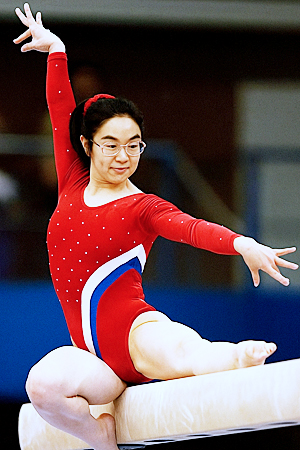 ところが、次の作品で、AIのやつ、一転して、名誉挽回!!・・・「AIを困らせてやるぞ!!」と、邪悪な動機に満ちながら、「平均台で演技する新体操の女性選手に変身」と命じてみたところ、納品されてきたのが、こちら・・・