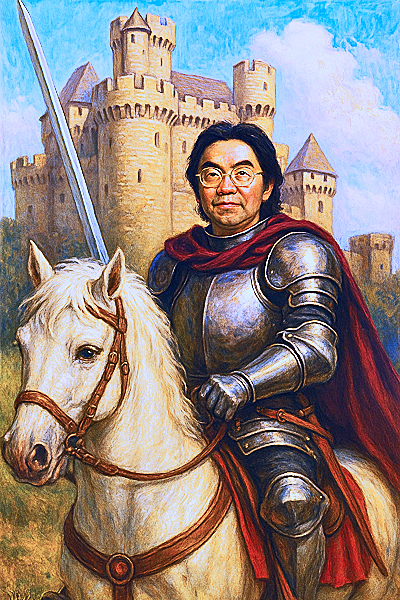 まず、制作者の私自身が、一番気に入っている作品が、こちら・・・AIによる自動画像生成ソフトに、上記の私の肖像写真を記憶させて、「白馬に乗った中世の騎士(男性)」「使命感に燃える勇ましい表情」「右手に剣を持つ」「背景に中世の城と青空」と指示した結果、約1分後に、次の画像が「納品」されてきましたよ。