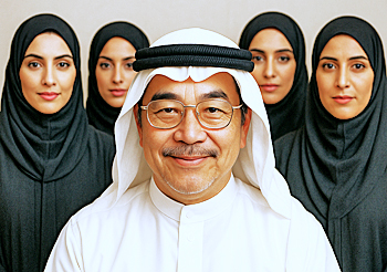 さらに、「アラブの大富豪に変身」と命じてみたところ、AI君から提出されたのが、こちらの作品・・・思わず、「おい、これじゃ僕は、ただの好色なエロオヤジじゃないか!!」と、パソコンに向けて猛抗議した私です(笑)。