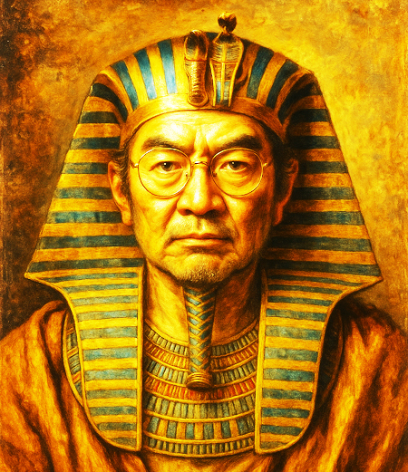 う~ん、これは・・・「傑作編」ではなく、「問題作編」の方に入れるべきだったかな?・・・ただ単に、「ツタンカーメン」とだけ指示してみたところ、この作品が納品されてきましたよ。厳しい表情にする指示は出していませんから、AI君が独断と偏見で、「ツタンカーメンは厳しい表情をしているはず」と、決めつけた模様ですが・・・人間の顔の下に、アレを取り付けてしまっているのも、どうなんでしょうねぇ・・・