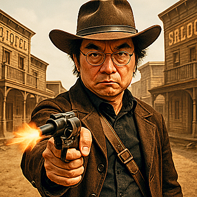 おっ、いい感じですねぇ!!・・・「西部劇のガンマン」「中年男性」「真剣な渋い表情」「拳銃を撃ちながら決闘中」「背景に西部劇の街並み」と、具体的に指示してみたところ、忠実に描写してくれました。AI君、素晴らしいお仕事ぶりです!!