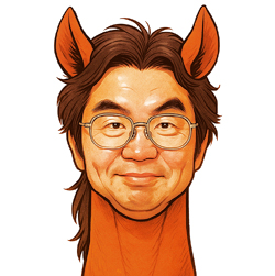 さらに、趣向を変えて、「馬の顔を、私の顔写真に似せてイラスト化する」と命じてみたところ、ほら、これですよ・・・まあ、AIは、良くも悪くも、バカ正直ですからねぇ・・・