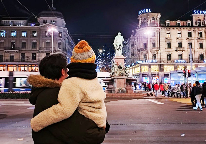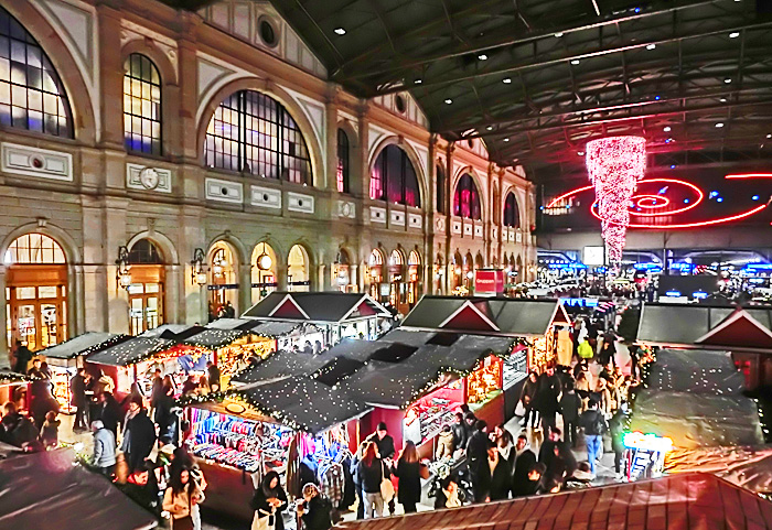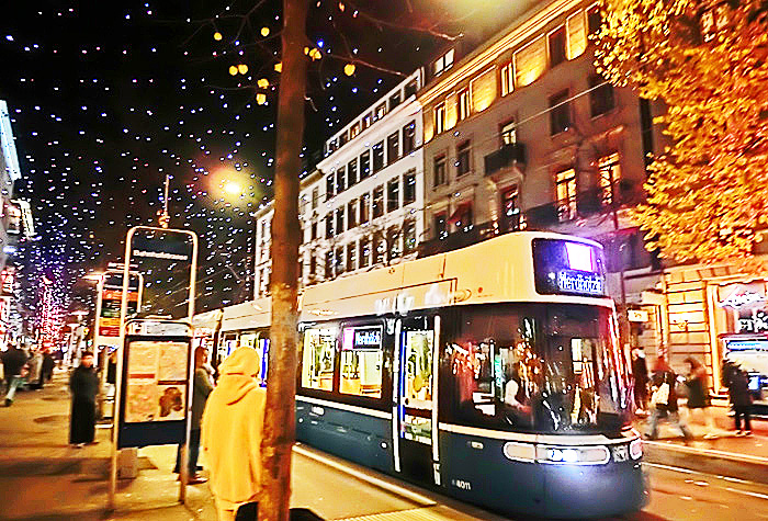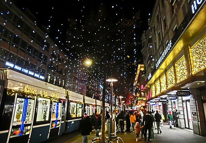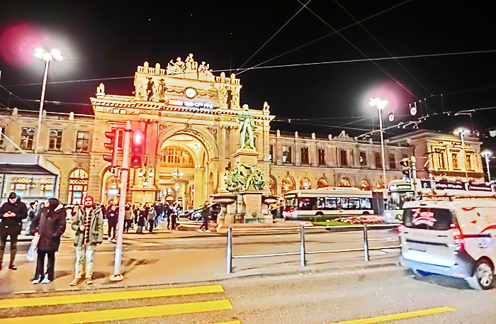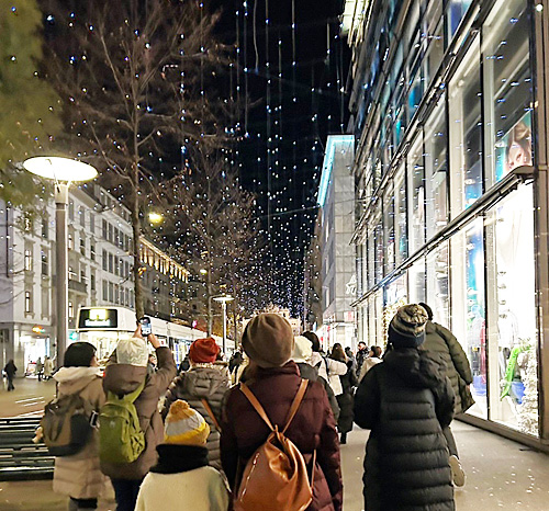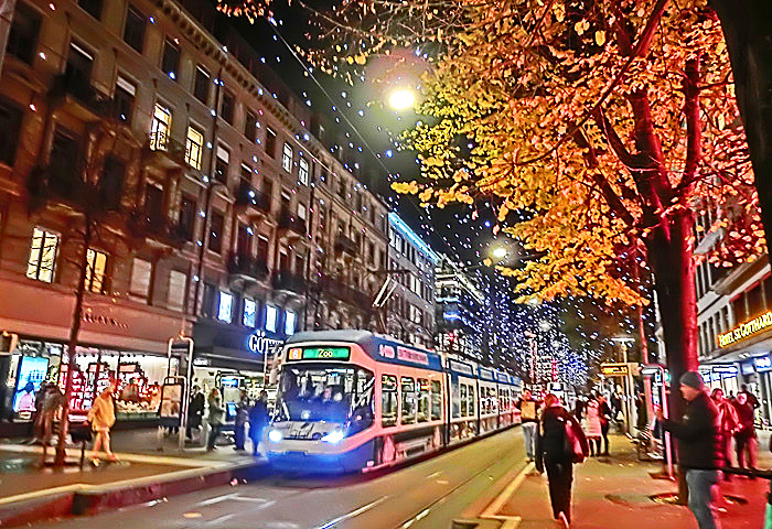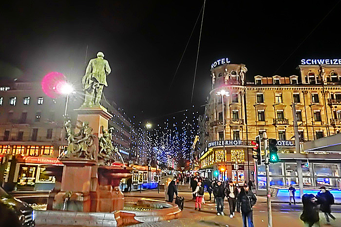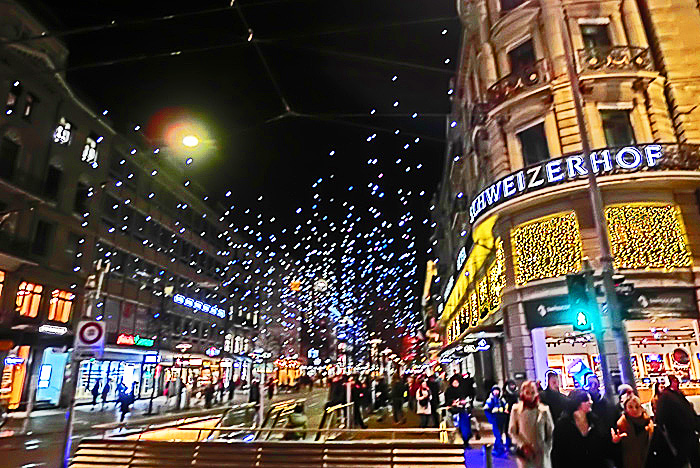 さあ、これから、美しいイルミネーションで彩られている、チューリッヒ中央駅前の大通りを、30分間ほど、お散歩してみましょう!!