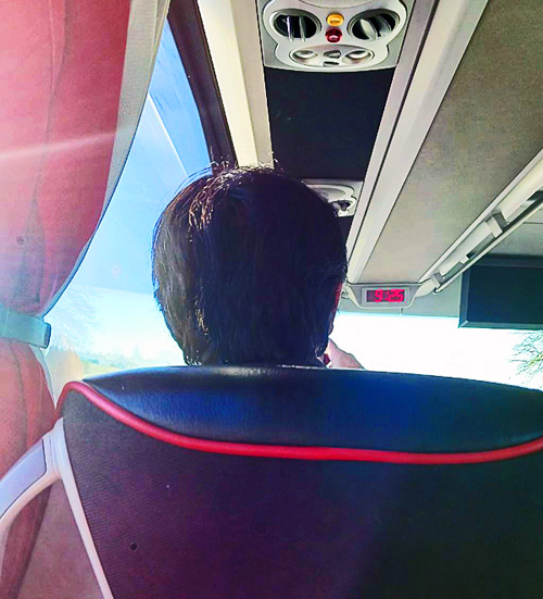 すぐ後ろの座席から、私の後頭部を写してくださった作品を頂戴したので、よく観察してみると、前方の表示板には、「9:25」という時刻が・・・あれ? 先ほどから表示されていた数字は、外気温だとばかり思っていましたが・・・上記の写真たちを見直してみると、数字の位置が移動していたり、「0」の文字サイズが半分になっていたりと、何だかヘンですねぇ・・・あれは本当に、外気温だったのでしょうか?(笑)