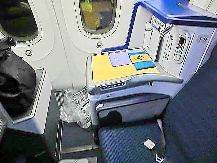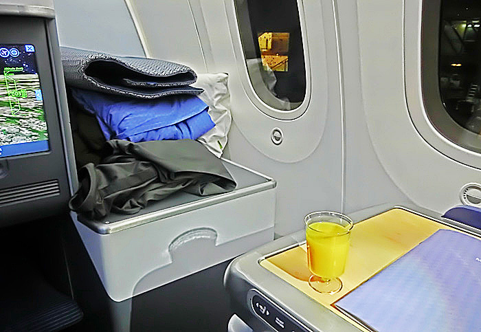 私の座席を探してみると・・・なんと、幸か不幸か、最前列でしたよ。下記写真のテーブルに置いてあるのは、ウェルカム・ドリンクとして選んだ「オレンジジュース」で、前方に折りたたんであるのは、後で座席を水平にした時に使う、マットレス&敷ぶとん&掛ぶとんです。完全な水平状態のベッドで眠ることができるのが、ビジネスクラス最大のメリットなんですよ。(ここだけの話ですが、ふとん類は、いわゆる「せんべいぶとん」ですけどね・・・)