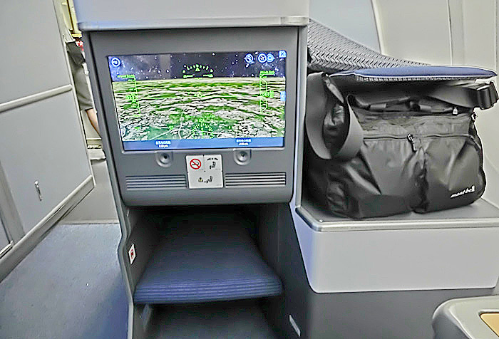 ご覧のように、足は、前方のモニターの下に入れて、楽々と伸ばしながら眠ることができますよ。足が長すぎる民族の方々には、ちょっと長さが足りないかもしれませんが、我々のような日本民族にとっては、幸いなことに、まったく問題の生じない長さです。