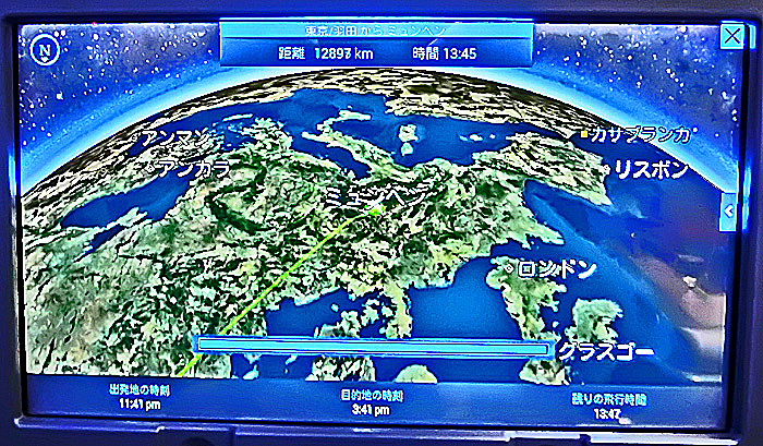 さっそく、モニターの画面を開くと、ミュンヘンへの航路情報が、表示されていますよ・・・これから、13時間45分ほどのフライトに、いよいよ出発しま〜す!!