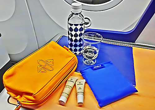 各座席に配布されているのは、ミネラルウォーター、黄色いポーチ、よくわからないクリーム類2つ(おそらく食べてはいけません)、よくわからない青い袋(何を入れるのでしょうか?)・・・なんだか、数年前に乗った時よりも、コストダウンされているような気が・・・まあ、私に関係するのはミネラルウォーターだけなので、何の不満もありませんけどね(笑)。