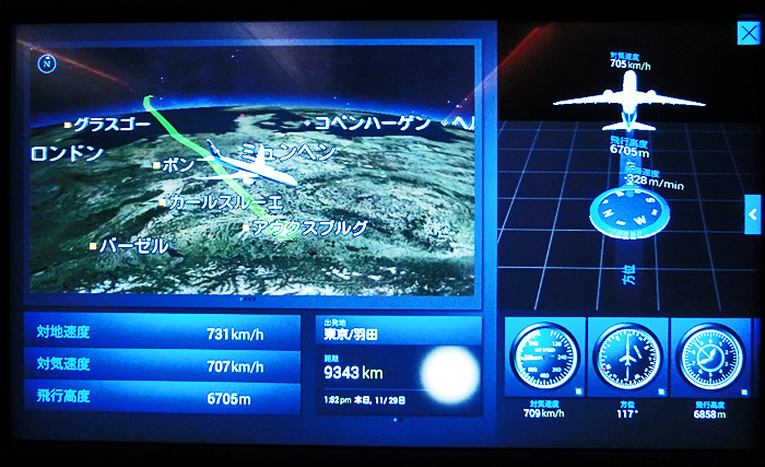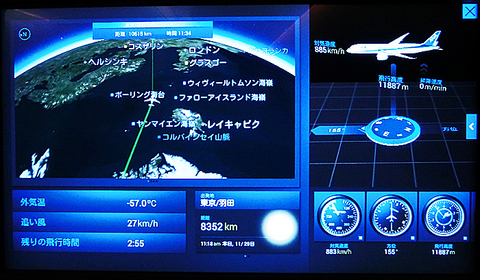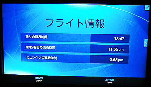ふと我に返って(笑)、CAさんではなくモニター画面の方を凝視・観察すると、そこにはフライト情報が・・・羽田が11時55分、ミュンヘンが3時55分となっていますから、差し引きすると、マイナス8時間の時差があるわけですね。