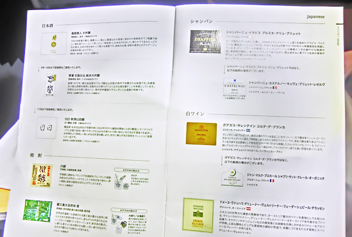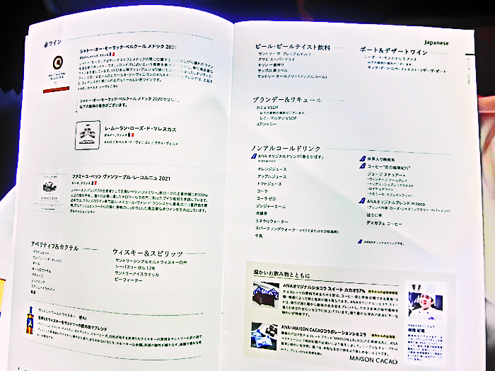 さて、ビジネスクラスの楽しみである、豪華な食事メニューを、観察してみましょうか・・・もちろん、世界各国の名酒が、いくらでも、飲み放題ですよ!!