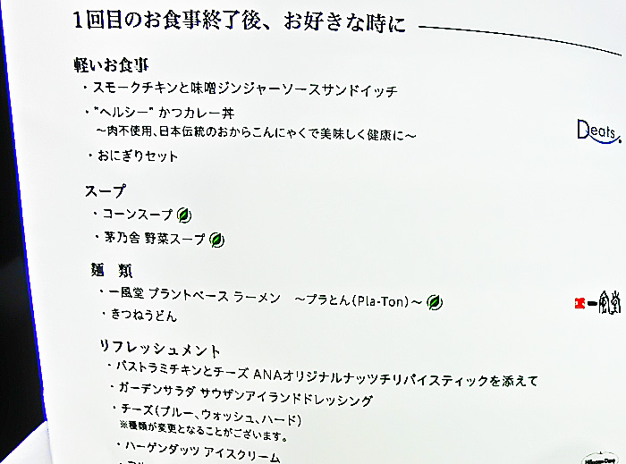 なお、わがビジネスクラスでは、上記の深夜食を済ませた後に、いつでも、下記の様々なメニューが、食べ放題なんですよ。この私も、ぜんぜんお腹が減っていないのに、「せっかくだから、かつカレー丼か、一風堂のラーメンか・・・そこまではお腹に入らないなら、せめて、茅乃舎の野菜スープか、ハーゲンダッツか・・・」などと思案しているうちに、日本時間の午前2時を過ぎ、いつの間にか、眠ってしまっておりました(涙)。