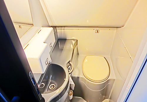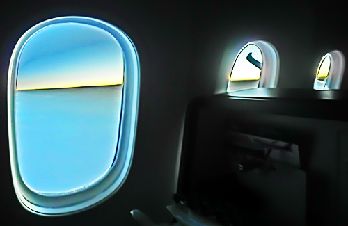 ただし、この最前列座席は、窓が遠いのが難点・・・通常、ビジネスクラスに乗るような客は、飛行機に乗り慣れており、窓に張り付いて景色を見たがったりしませんから(笑)、窓が遠くても問題は生じないのでしょうね。