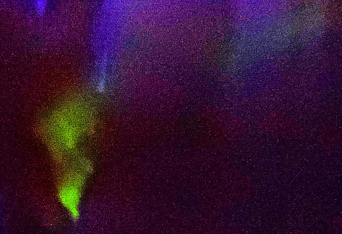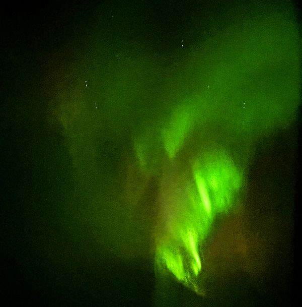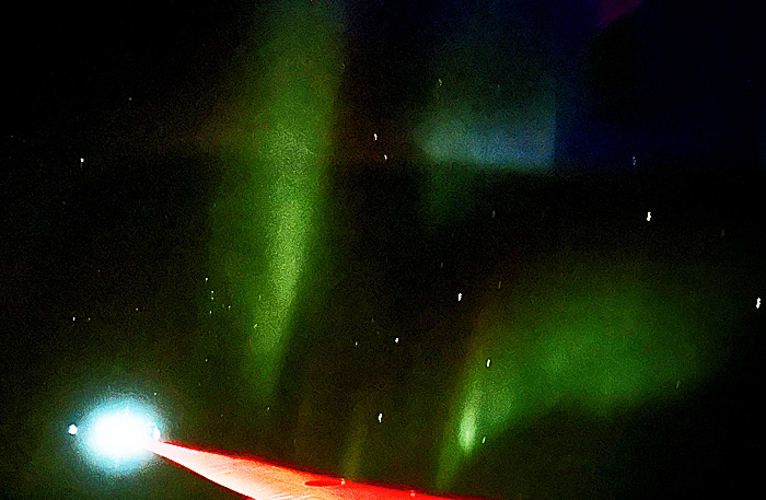 次の2枚は、ちょうど翼が見える位置に乗っていた、「光の学校」スタッフが撮影したもの・・・ご覧のように、同時に翼が写っているわけですから、「飛行機の中から本当にオーロラが見えたのだ」という、決定的証拠になりますよね(笑)。