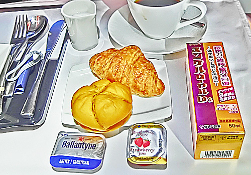 右端のユンケル(栄養ドリンク)は、もちろん、私が持参したものであり、CAさんが配ってくれたわけではございません(笑)。