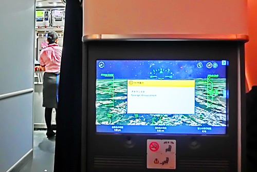 う〜ん・・・この座席、最前列なので、すぐ目の前が、CA(キャビン・アテンダント = 客室乗務員)さんの作業場になっており、正直、まったく落ち着けません(涙)。実際、作業の様子が丸見えだったり、CAさんたちの会話が大きく聞こえたり、真横の通路を頻繁に往来なさるんですよ。CAさんたちを凝視・観察したいマニアの方々にとっては、夢のように最適な座席なのでしょうが、ひたすら安らかに心身を休めたい私にとっては、めちゃ困惑する環境・・・