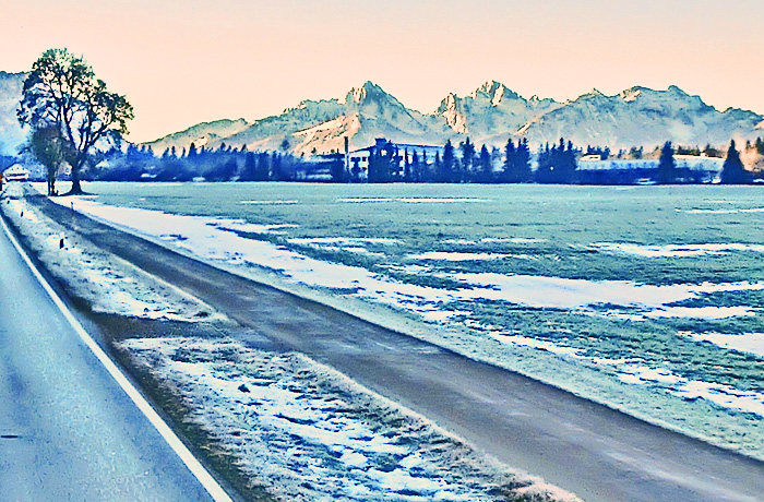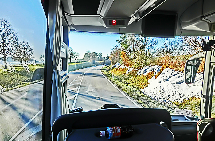 おや? 路肩には、雪が現れてきましたよ・・・標高が上がって、アルプス山脈が近づいてきた証拠ですね。気温は「9度」と表示されているので、恐れていたほどには、寒くなさそうですが・・・