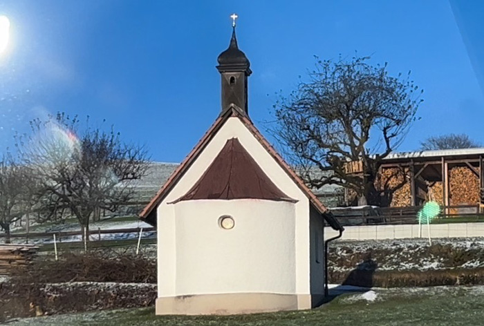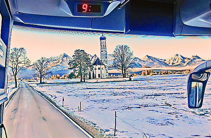 さて、我々の乗ったバス2台は、ドイツのバイエルン地方から、スイスとの国境を目指して走ります・・・車窓から、たまたま見えた、この小さすぎる教会、とっても可愛いですね!!(わずか数名で、一杯になってしまいそうな気が・・・)