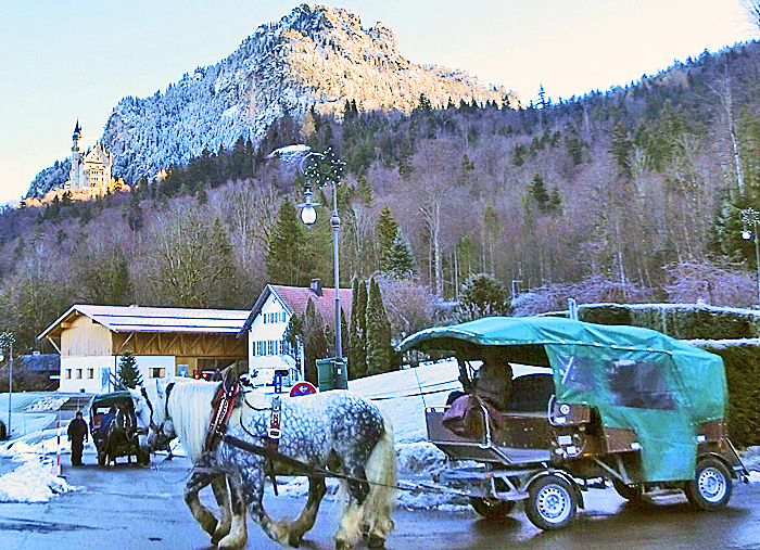 この時期には、お城に登る道路が凍結するため、シャトルバスは運休しており、わずかな馬車だけが稼働中・・・ただし、閑散期のため利用客が乏しいので、「馬の食費も出ないのでは?」と、馬たちを心配してしまいました。