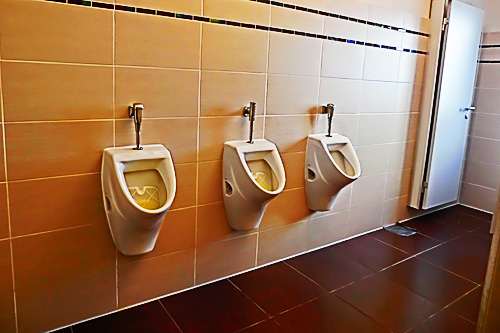 ちなみに、女性にとっては無益な情報ですが、日本人男性諸氏のために、念のため忠告しておきますと・・・ヨーロッパの男性用便器は、取り付け位置が非常に高いため、平均的身長の日本人男性だと、爪先立ちながら用を足す必要がありますので、ご注意を。(ご参考までに記しておきますと・・・身長175センチの私でも、何とか懸命に頑張って、ギリギリ届く感じでございました)