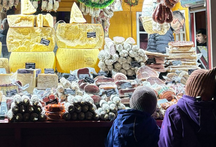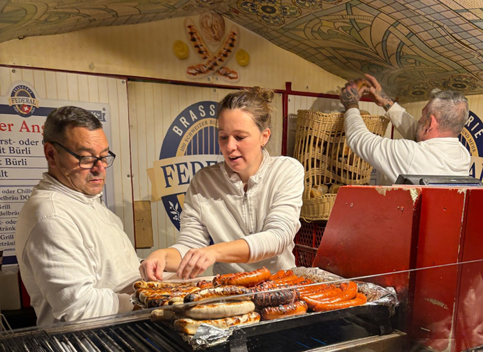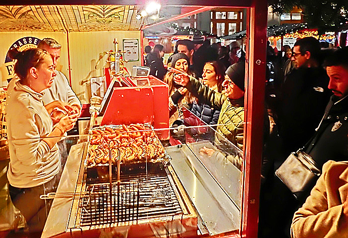 女性客が群がっているのは、主に「可愛いもの」や「チーズ」などですが、男性客が群がっているのは、たいてい、「ソーセージ」と「グリューワイン」のお店ですよ。