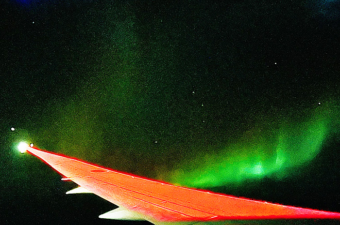 まさか、オーロラを、これほど間近に大きく観察することができるとは・・・北極圏を通るルートだからこそ可能であった、奇跡の体験でした。確かに、地上から見るよりも、よほど近距離から見るわけですから、大きくて鮮明なのも当然ですよね。雲よりも高い上空を飛んでいるのですから、下界の天候の影響など、まったく受けませんし・・・