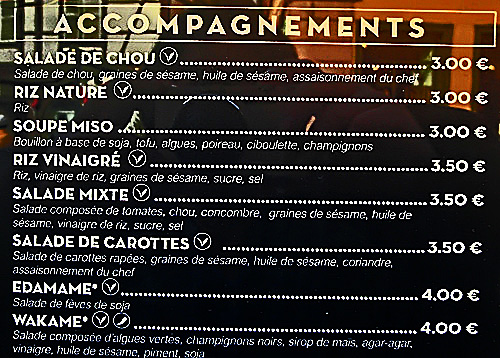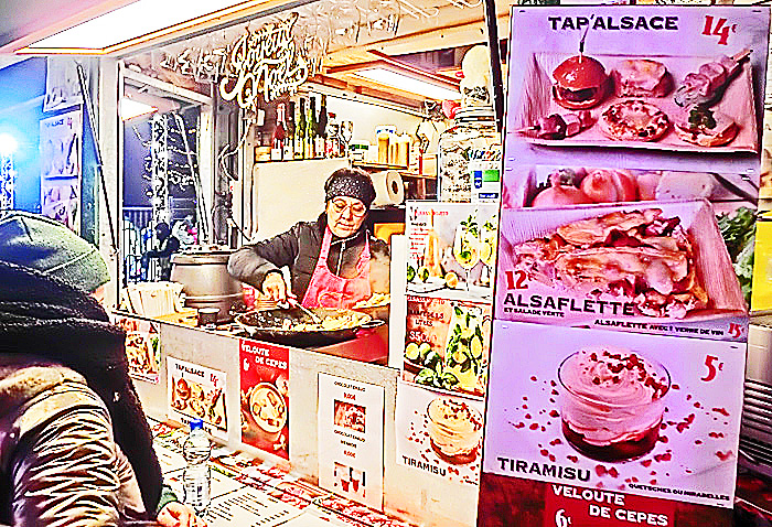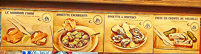 次の写真の右側に、縦に並んでいるメニューの一番上は、「アルザス名物セット」という意味ですね。そして、一番下は、ご存じ「ティラミス」に違いありませんが・・・2番目の「ALSAFLETTE」という物体が、いくら調べても、ネット上で解明できませんでした。ああ、悔しい・・・