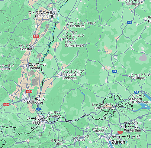 そう、フランス領である「コルマール」も「ストラスブール」も、すぐ近く(というか街の郊外)に、有名な「ライン川」が流れており、川の向こう岸は、ドイツの領土なのです。したがって、日常的に、フランス領とドイツ領を行ったり来たりしながら、通勤や買い物をする人々も多いはず・・・