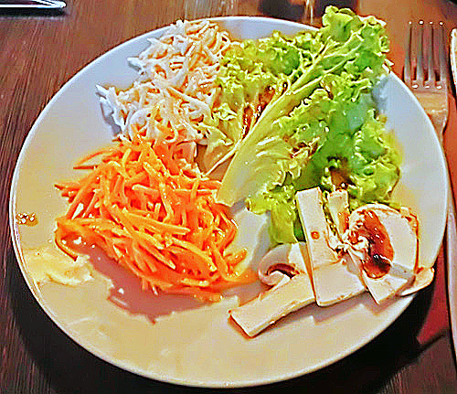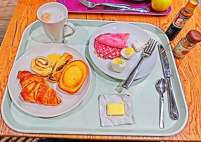 一番左が「スモークサーモン」、その右が、ご存じ「エスカルゴ」(でんでん虫ちゃん)、その右が、どう見ても「牡蠣」(かき)で・・・最後に、一番右が、「鶏肉のパイ包み焼き」と、ネットでは翻訳されたのですが・・・う〜ん、次の拡大写真からは、「食パンに何かが塗ってあり、横にピクルス(西洋漬物)が添えてある」かのように見えるんですよねぇ、これが(笑)。いったい、この謎の料理の正体は?