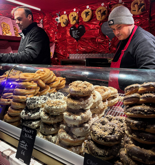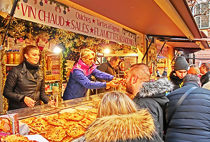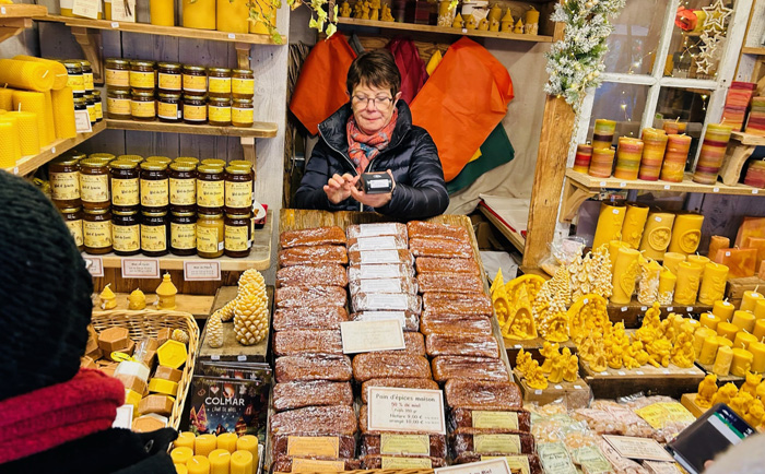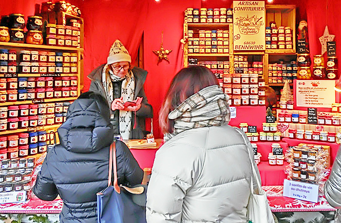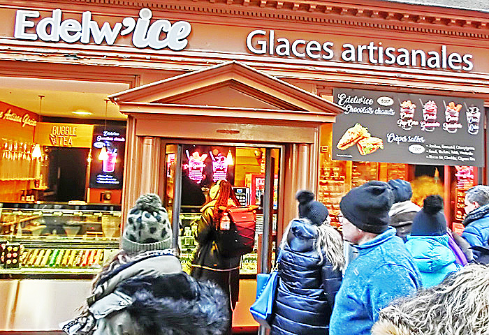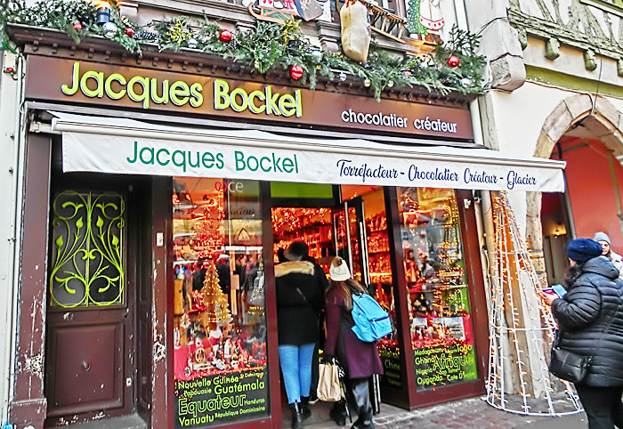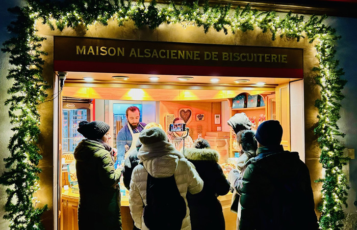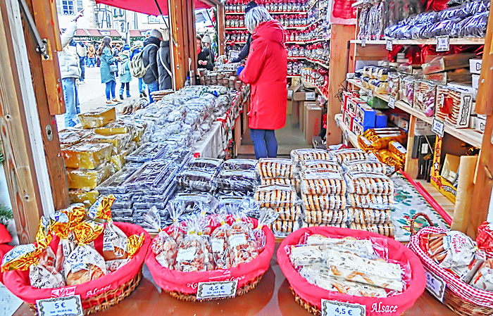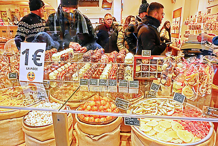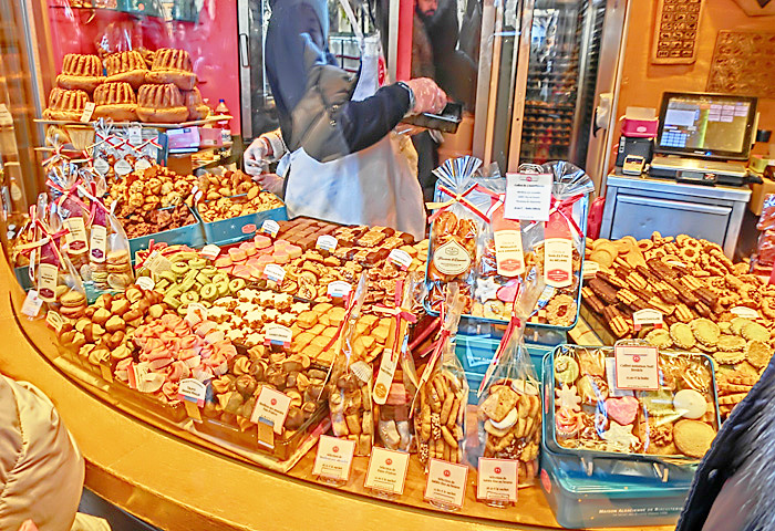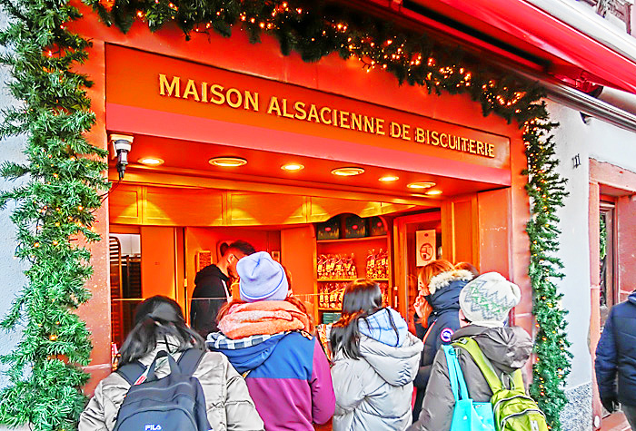 その右側で人目を引いているのは、昨夜も注目した、有名な「ビスケット」(アルザス風マカロン)屋さん・・・たまたま目撃したのですが、ちょうど、我々の旅の仲間たちが、「何にしようかな〜」と思案中。