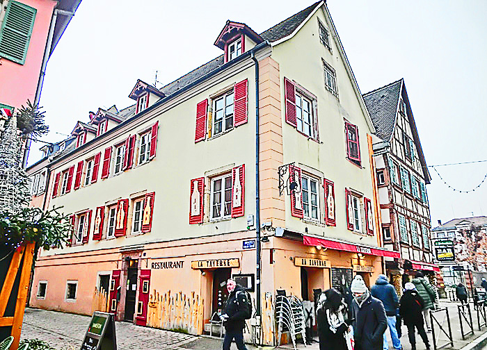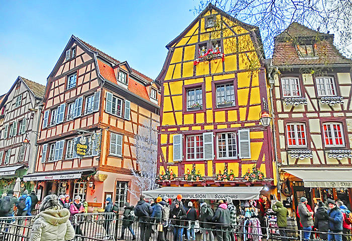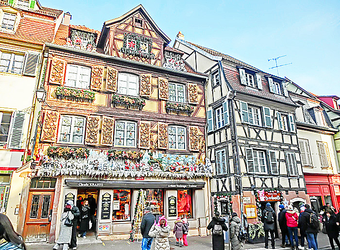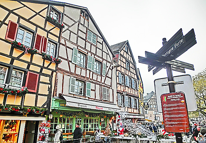 ご覧のように、アルザス地方の家屋の形は、ドイツ圏の影響が強く、「コロンバージュ」と呼ばれる、「木骨組み&しっくい固め」の建物が特徴・・・しかも、コルマールでは、すべての建物が別々に設計・建築されているため、外観が同じ建物は、一軒も存在しないのだそうですよ。だからこそ、街並みが、「手作り感」に満ちているわけですね。