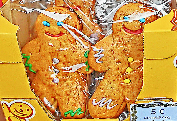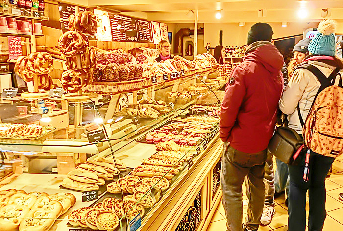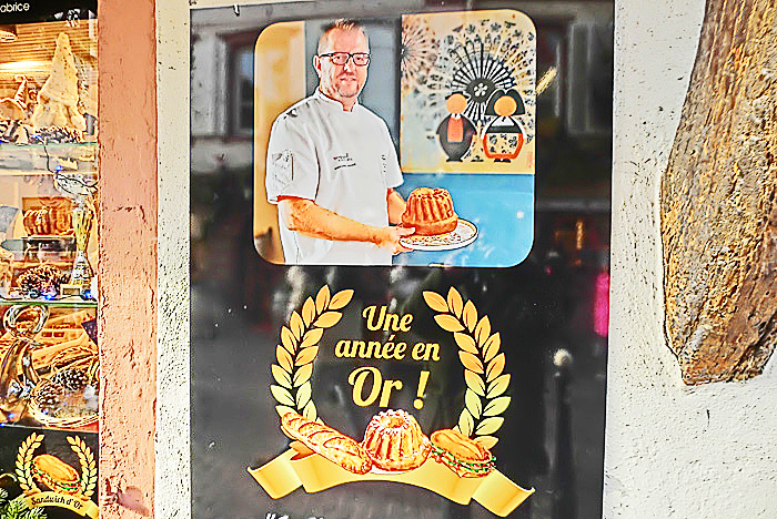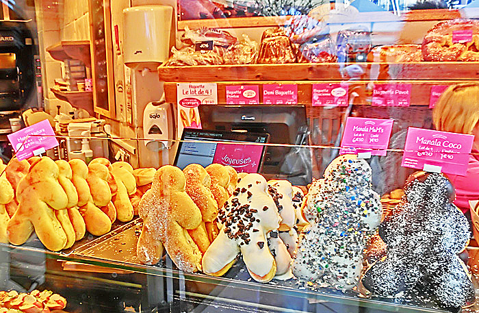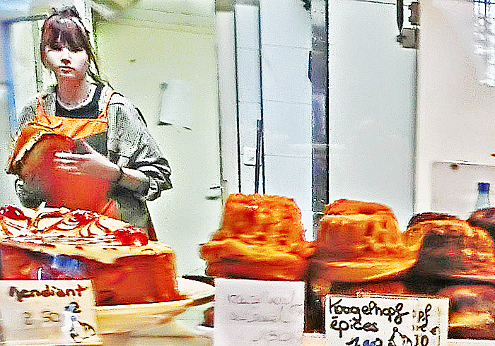 焼きたてのビスケットを、無料サービスで食べさせてくれるため、その美味しさに驚いた人々に、飛ぶように売れていますよ。(左上の位置に、ひょうきんな「クグロフ」たちも並んでいますから、お見逃しなく!!)