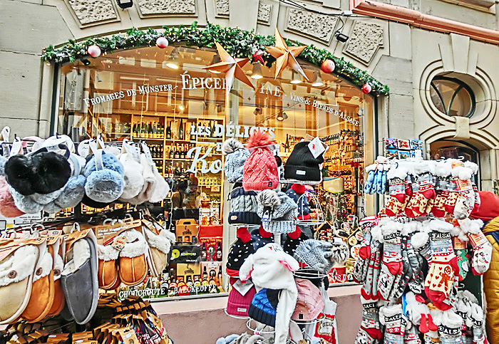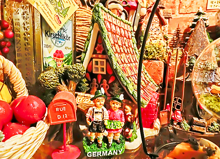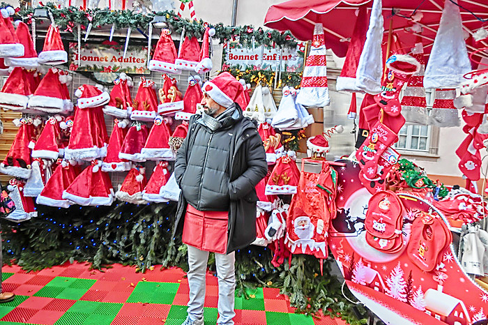 次にご紹介するのは、こちら・・・コルマール滞在中に、このお店の前を何度も通りましたが、どうやら「シフト制」ではないご様子で、夜も昼も、この同じ男性が店番をなさっていましたよ。赤い帽子については、売り物なので理解できるのですが、下半身を隠している赤いものは、いったい、何を、どうやっているのでしょうか?(そもそも、なぜ、この部分を、赤く強調なさっているのでしょうか?・・・笑)