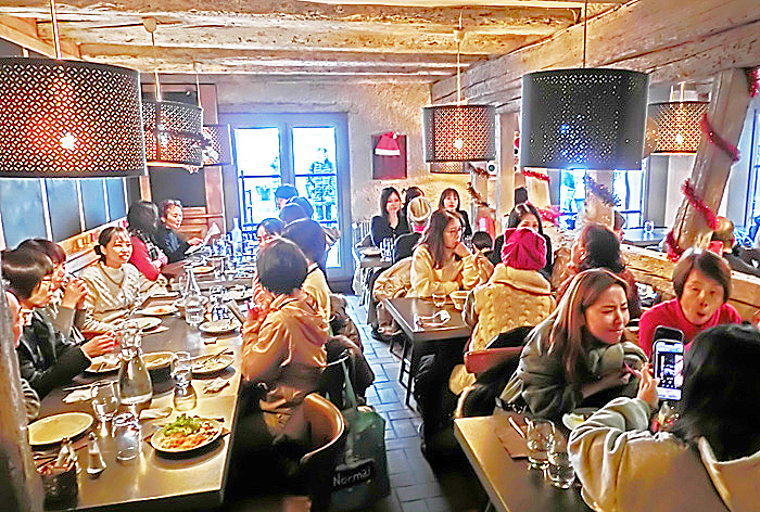 ちなみに、それらの言語を分析すると、フランス語、ドイツ語、英語、イタリア語、スペイン語については、私にも聴き取れましたよ。アジア系の民族は、ほとんど見かけませんでした。その証拠に、我々が60数名の団体で歩いていると、フランス女性のオバサンが、「ジャポネ、ジャポネ、ジャポネ!!」(日本人ばっかり!!)と、大声で苦笑していましたよ。(日本人は、他のアジア人と違って、お行儀の良い集団行動を取り、整然と静かに歩くのが特徴なので、わかりやすいとのこと)