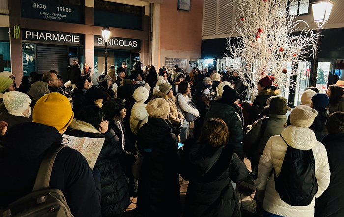 上記地図の最上部左手に書いてある、「MONOPRIX」(モノプリ:スーパーマーケット)の前に、いったん集合している我々の姿が、次の写真・・・白いツリーの下で、目立つ赤い帽子を被っているのが私であり、皆さんは、自然に私の方を向いて、私を取り囲むような形で立っています。