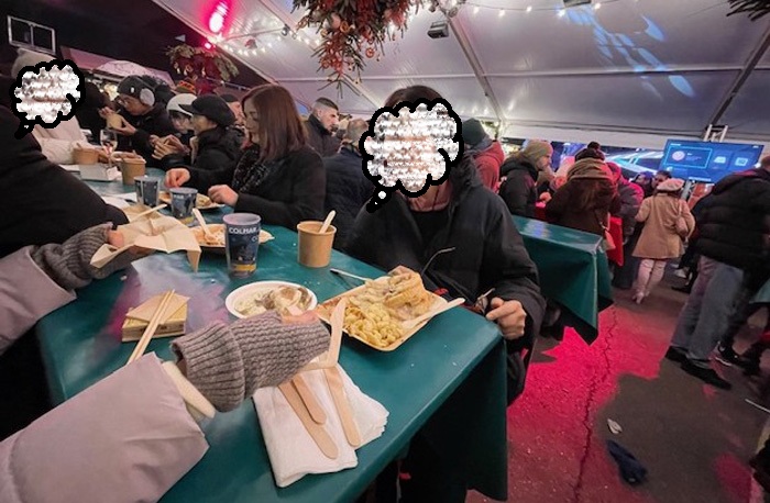 どうも不可解な点が多いので、実際に、お客様が、どのような物体を食べていらっしゃるのかを分析してみようと、写真の一部を拡大してみましたが・・・残念ながら、これから食べ物が運ばれてくる状況の様子で、テーブルの上には、まだ何も発見できませんでした(笑)。