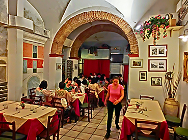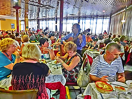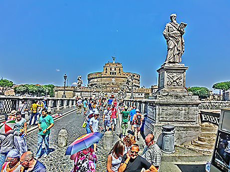 バスで「サンタンジェロ城」の前を通り、昼食会場へ。(右の写真の右手中央のお店です)
