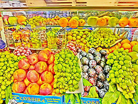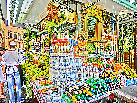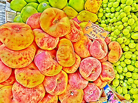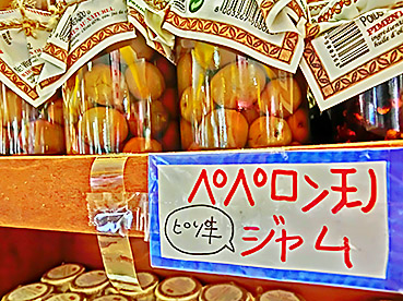 泉の横の果物屋さんの屋台?には、「赤血球」にそっくりな(笑)、不思議な形の桃が・・・
