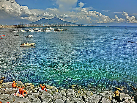 有名な「サンタ・ルチア」の海岸が広がっており、ナポリ港の向こうには、ベスビオ火山の雄姿。