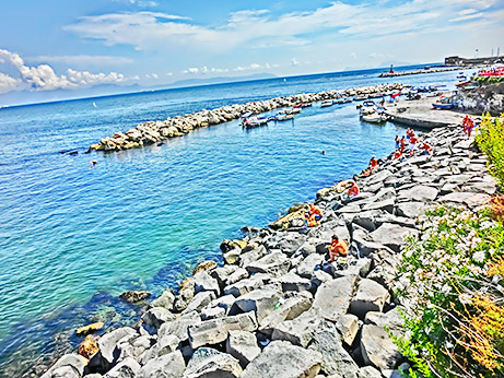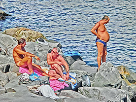 砂浜の無い海岸では、石のうえで、市民たち(なぜか中年男性ばかり)が、日光浴を楽しんでいます。