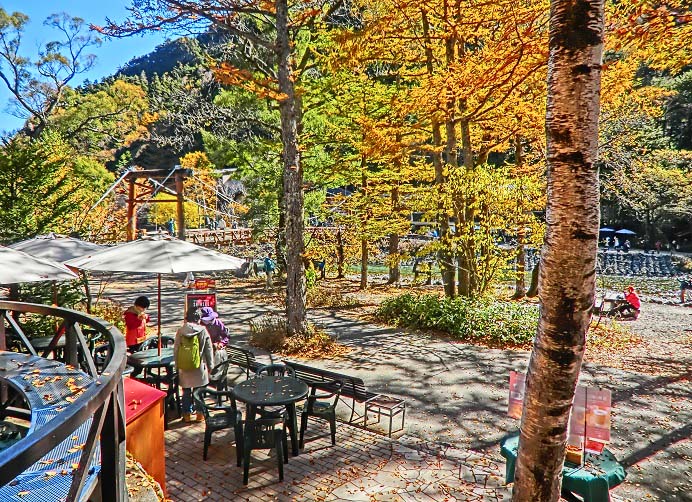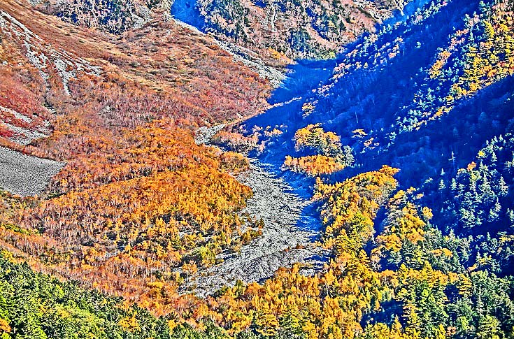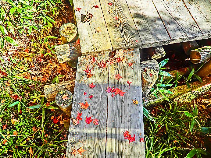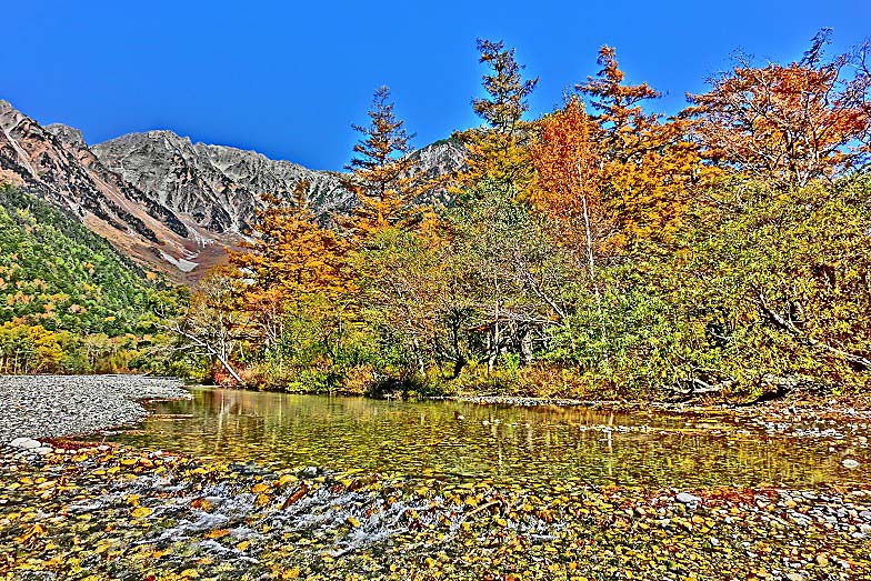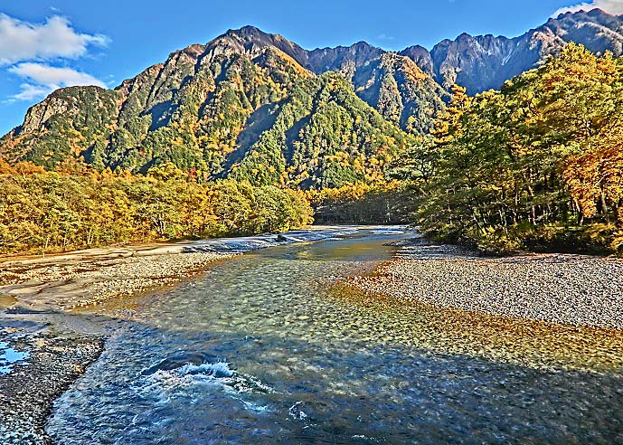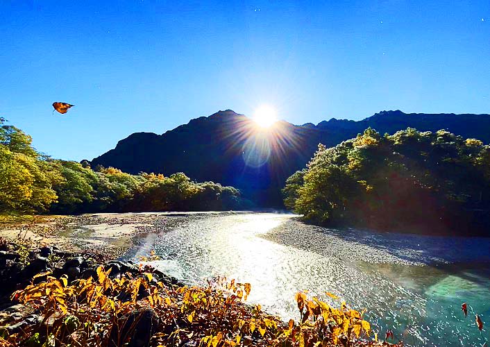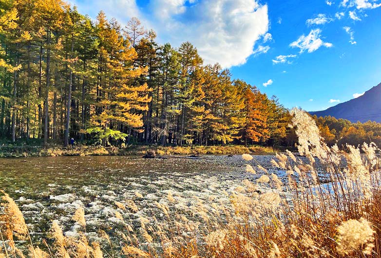 梓川の流れの上に立つと、対岸から眺めていた紅葉が、ぐっと身近に感じられます・・・