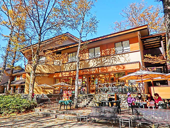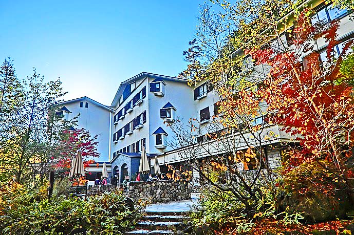 観光客や登山客で賑わう「河童橋」周辺のホテルと違って、ほとんど一般客は通りかからない、閑静な場所に建っていることが、このホテルの魅力です(河童橋までは徒歩10〜15分)。しかも、私の人生に欠かせない「露天岩風呂」があるだけでなく、全ての客室のお風呂に、天然温泉が引かれているという贅沢さ!!