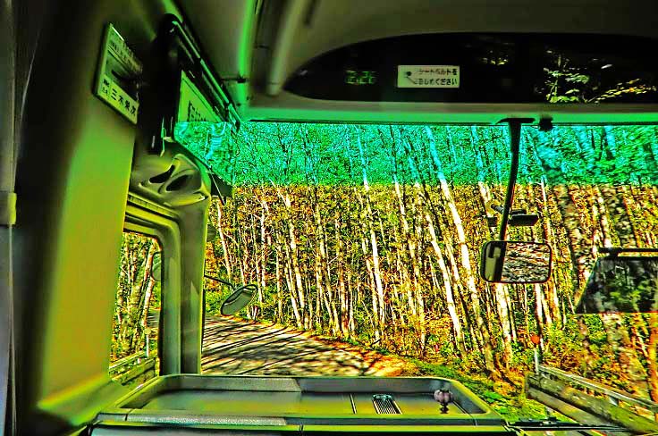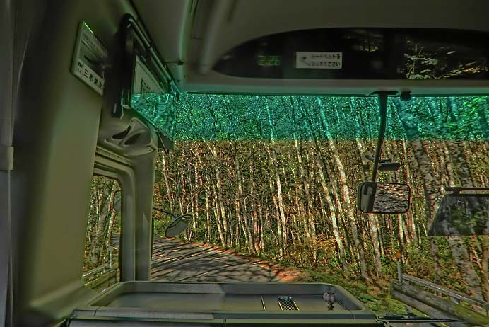 大型の観光バスを借り切り、北アルプスを目指して1時間ほど登ると、美しい白樺の林に突入しますが・・・う〜ん、気になる天候はと言えば、こんな感じで・・・