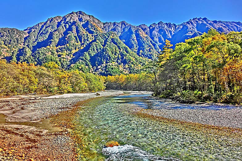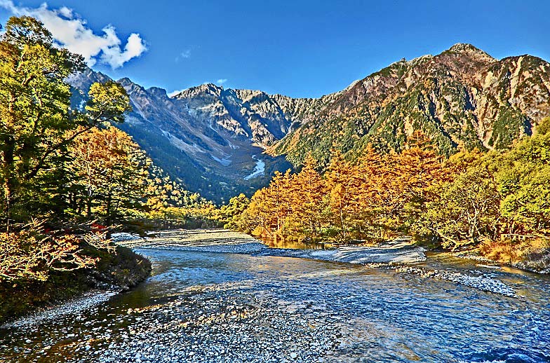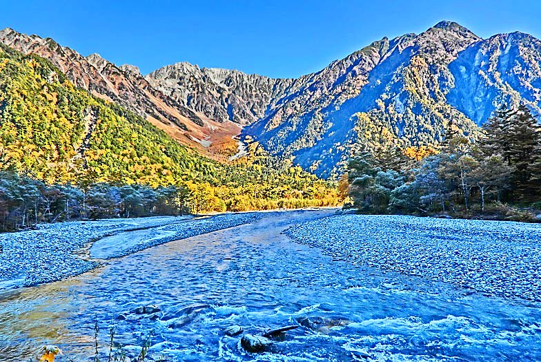 おお!! これぞ、上高地を代表する・・・いえ、日本を代表する、「山岳&清流&樹林」という豪華3点セットで構成された、完全無欠の山岳美!!