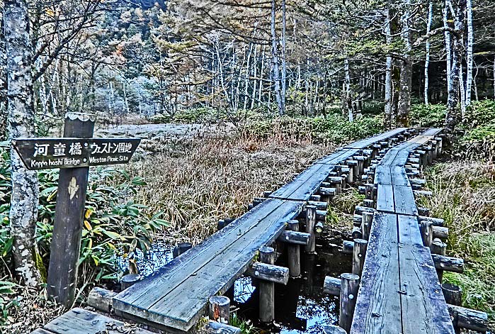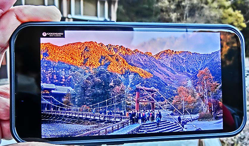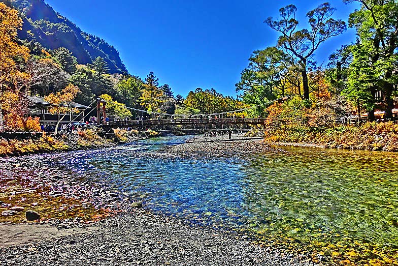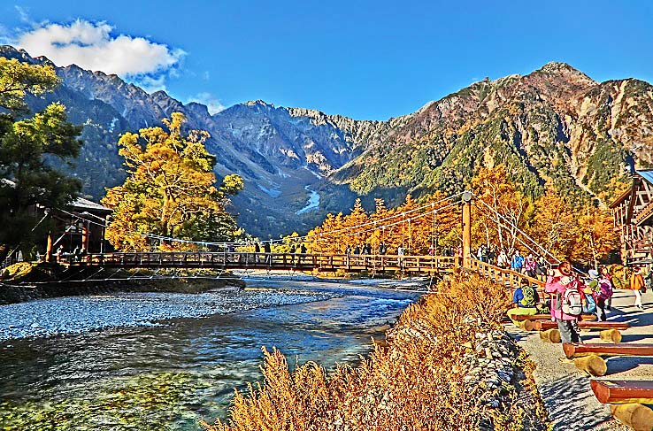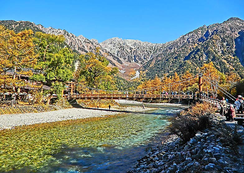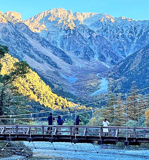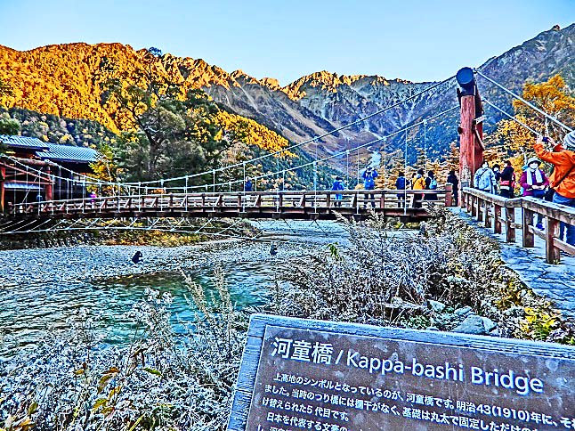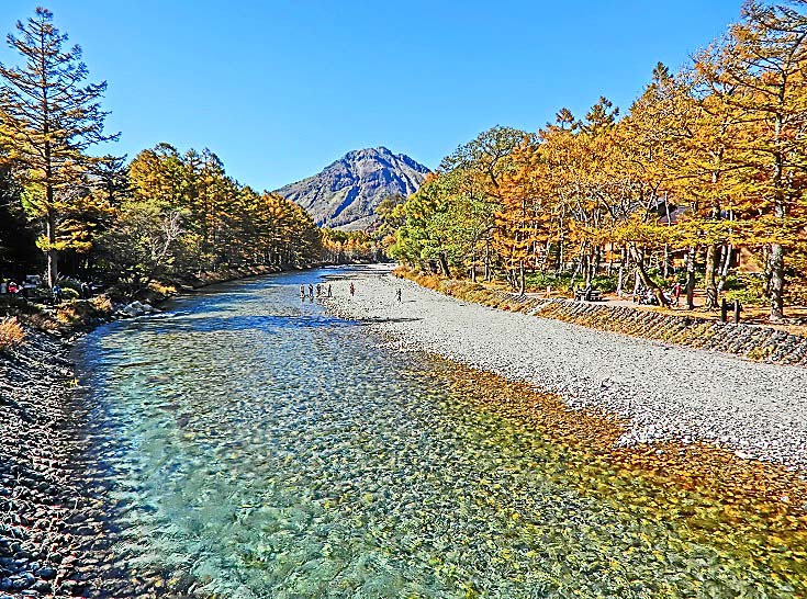 観光ガイドの本、パンフレット、ウェブサイトにおいて、しばしば、「上高地を代表する光景」として紹介されるのが、「穂高連峰を背景にした河童橋」という、この組み合わせ・・・「連峰」「清流」「個性的な橋」という豪華3点セットが、大いに興味を引くからでしょうね。