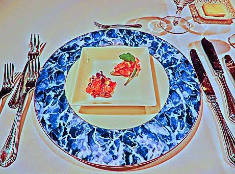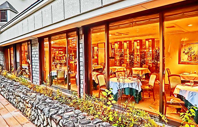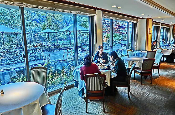 やがて、ホテルに戻った我々一行には、次の写真のオシャレなレストランで、フレンチ・ディナーコースの夕食が待っていますよ。2時間の散策で腹が減って、今にも、お腹と背中が、くっつきそう!?