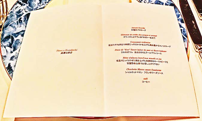 こちらが、今夜のディナーコースのメニューでございます。