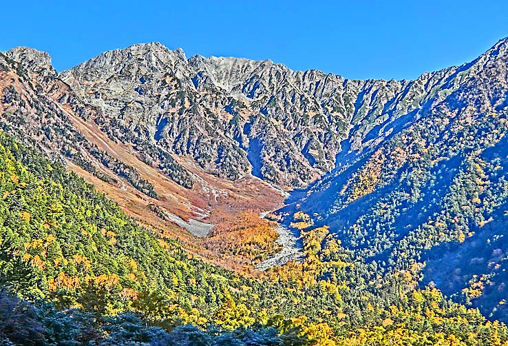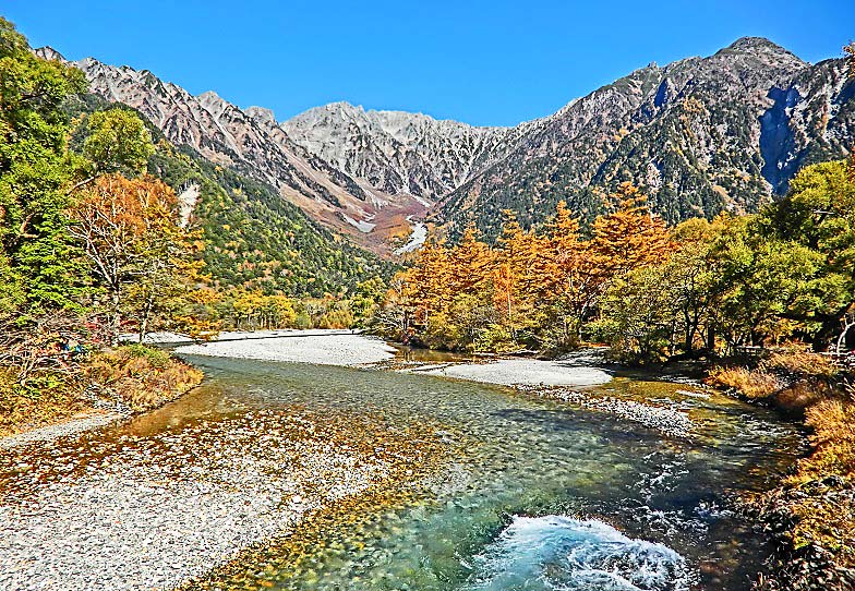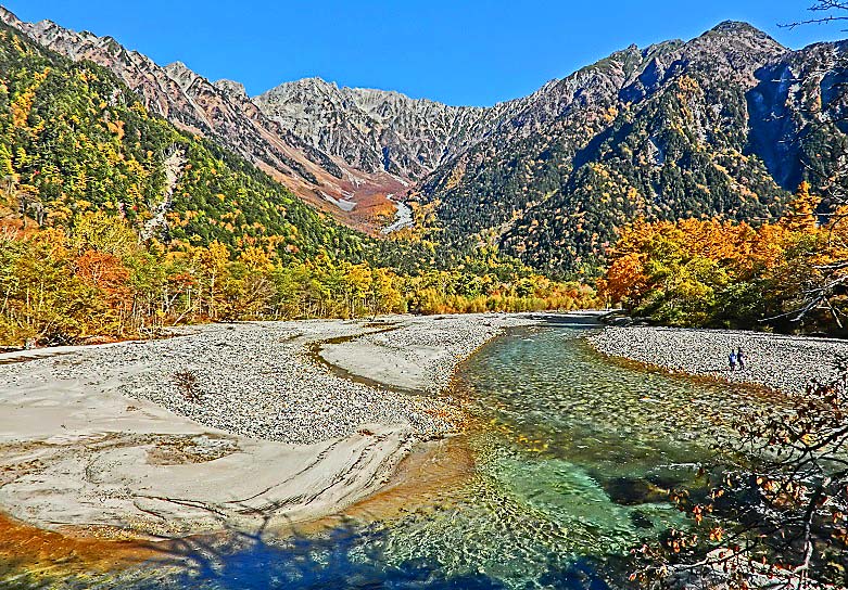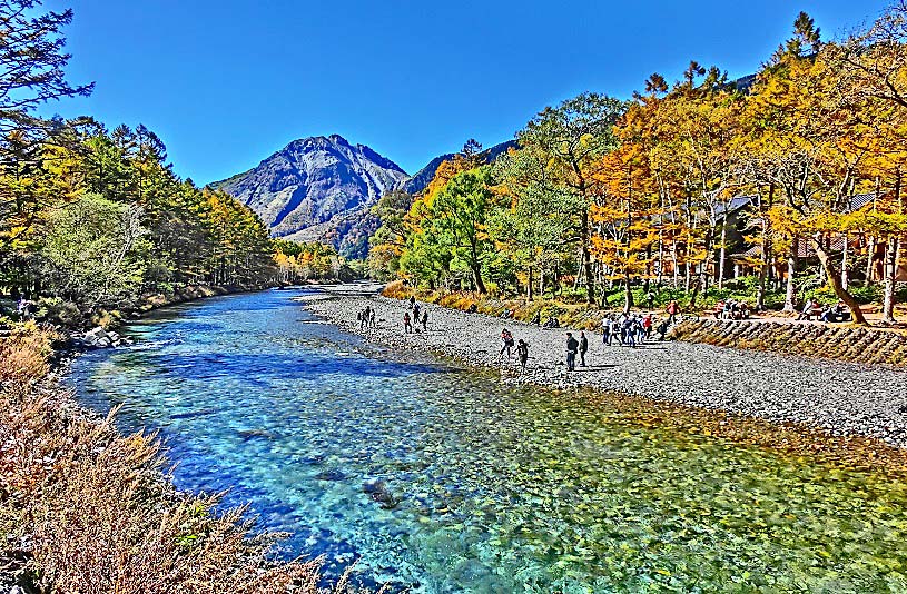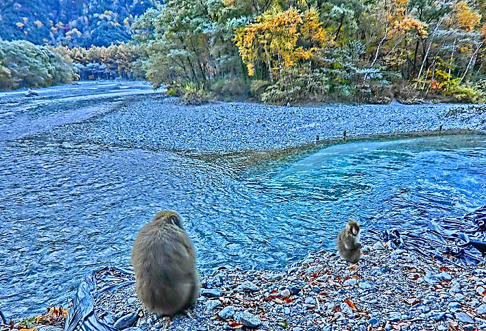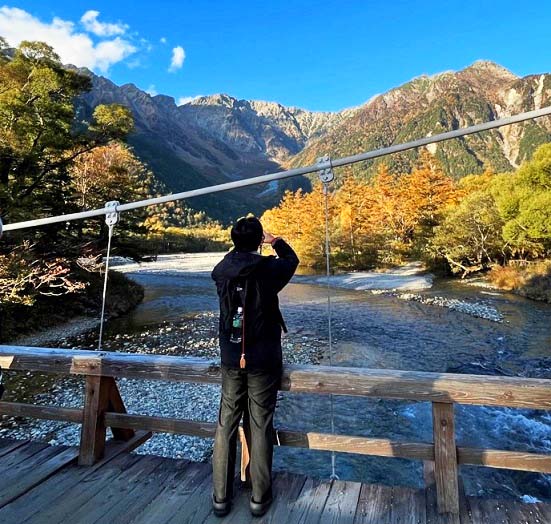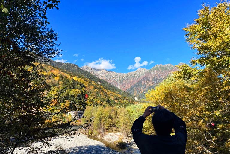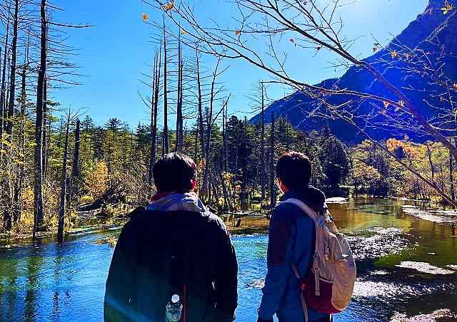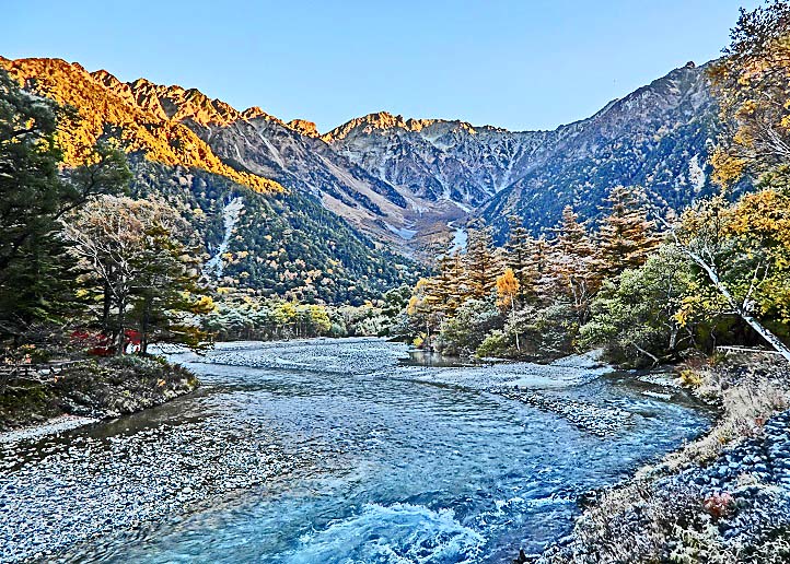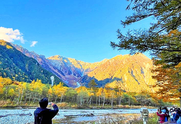 これほどまでに透き通った川は見たことが無く、嬉々として、その梓川沿いの遊歩道を歩き、動物園より間近にいた野生の猿たちに驚き、河童橋から見上げた穂高連峰や焼岳の雄大な山々は、雲ひとつかかることなく、どーんとそびえ立っており、その絶景に圧倒されました!