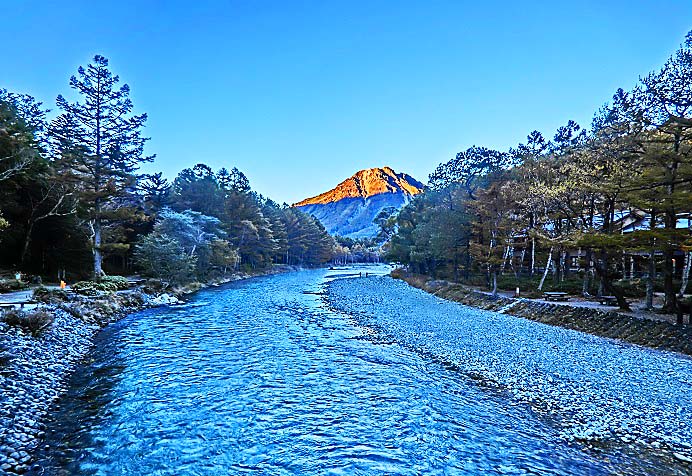 2日目は、なんと快晴!! 雲ひとつない!! 山の端々までくっきり鮮やかに見え、山肌が朝焼けのオレンジに染まり美しい。朝食後の散策では、森林浴そのもの。透明な、結構勢いのある水流を見ながら、緑を眺めて歩き、すごくたくさん歩いているのに、足取りは軽やかでした。上高地はとても清らかで空気も軽くて何だか聖地のようなところだと感じました。