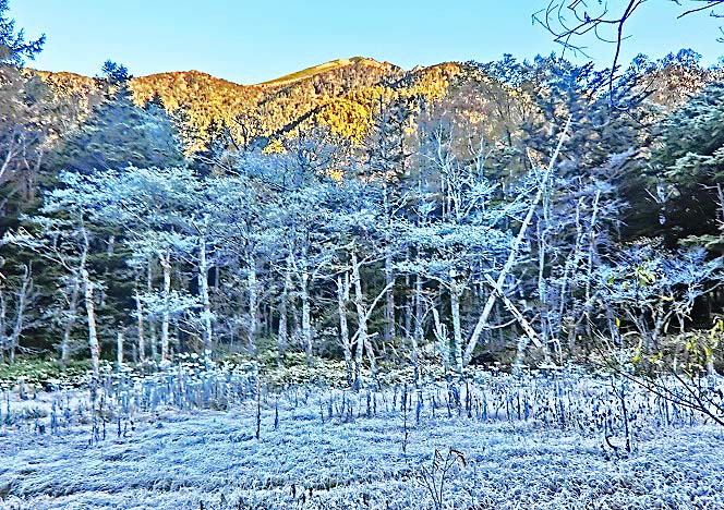 いつの間にか、焼岳の全体に陽光が降り注いでおり、本日も、雲一つない快晴に恵まれました。